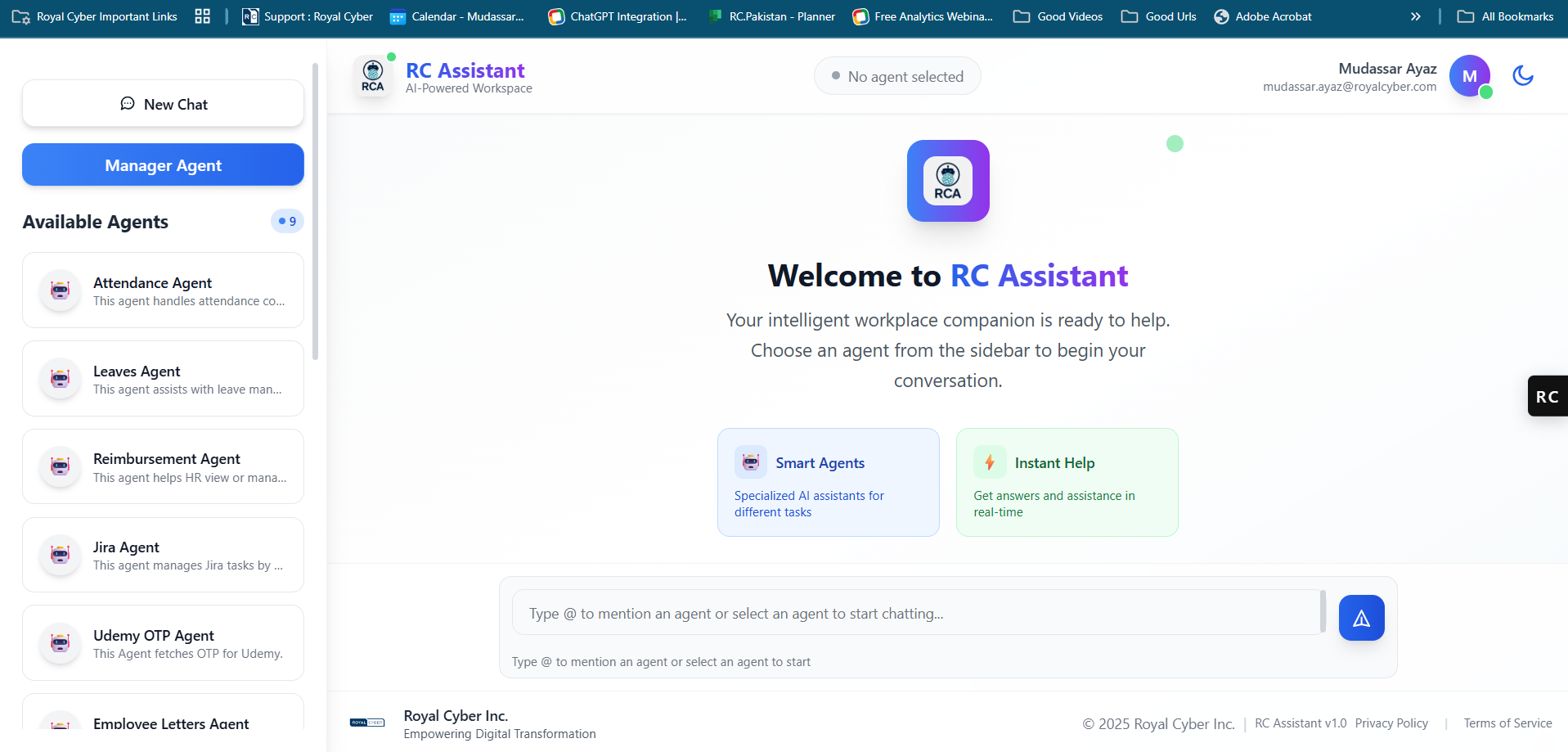 RC Assistant is an intelligent internal AI agent designed to streamline Royal Cyber’s day-to-day operations by integrating seamlessly with core enterprise systems such as Zoho People, Zoho Recruit, Business Central, Power BI, Freshdesk, IT NOC, Microsoft Teams, and Microsoft 365. It acts as a unified digital operations hub for employees and departments, offering both informational and actionable support in real time.