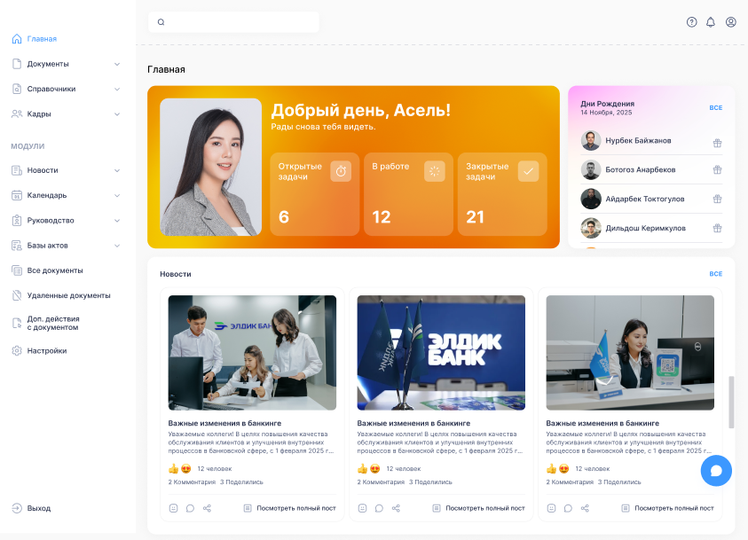 ElDome is a comprehensive corporate platform designed to digitize the internal ecosystem of Eldik Bank OJSC.