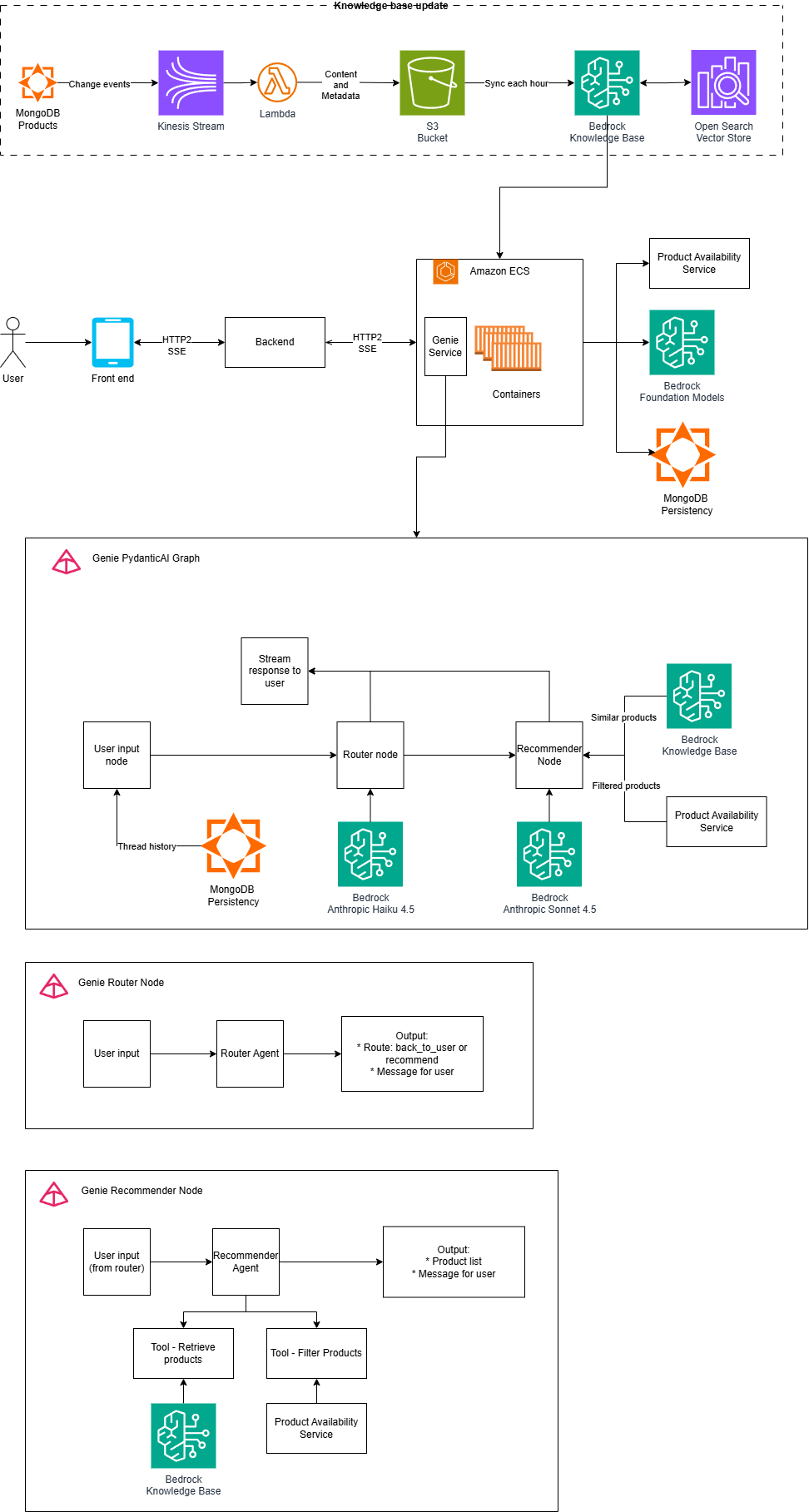 Genie runs on a cloud-native architecture blending AI reasoning, real-time data, and seamless mobile integration for intelligent, fast, and personalized experiences.