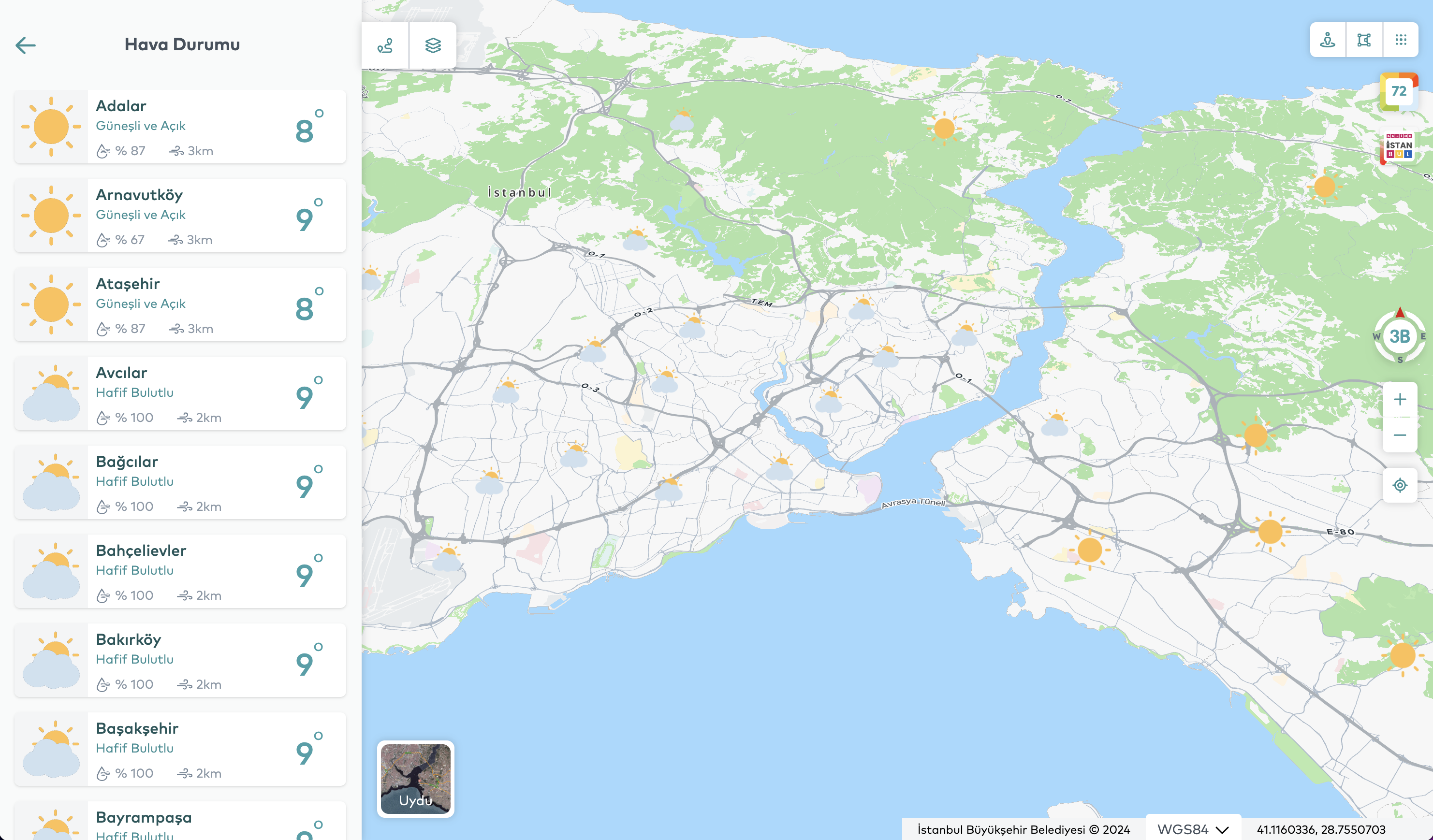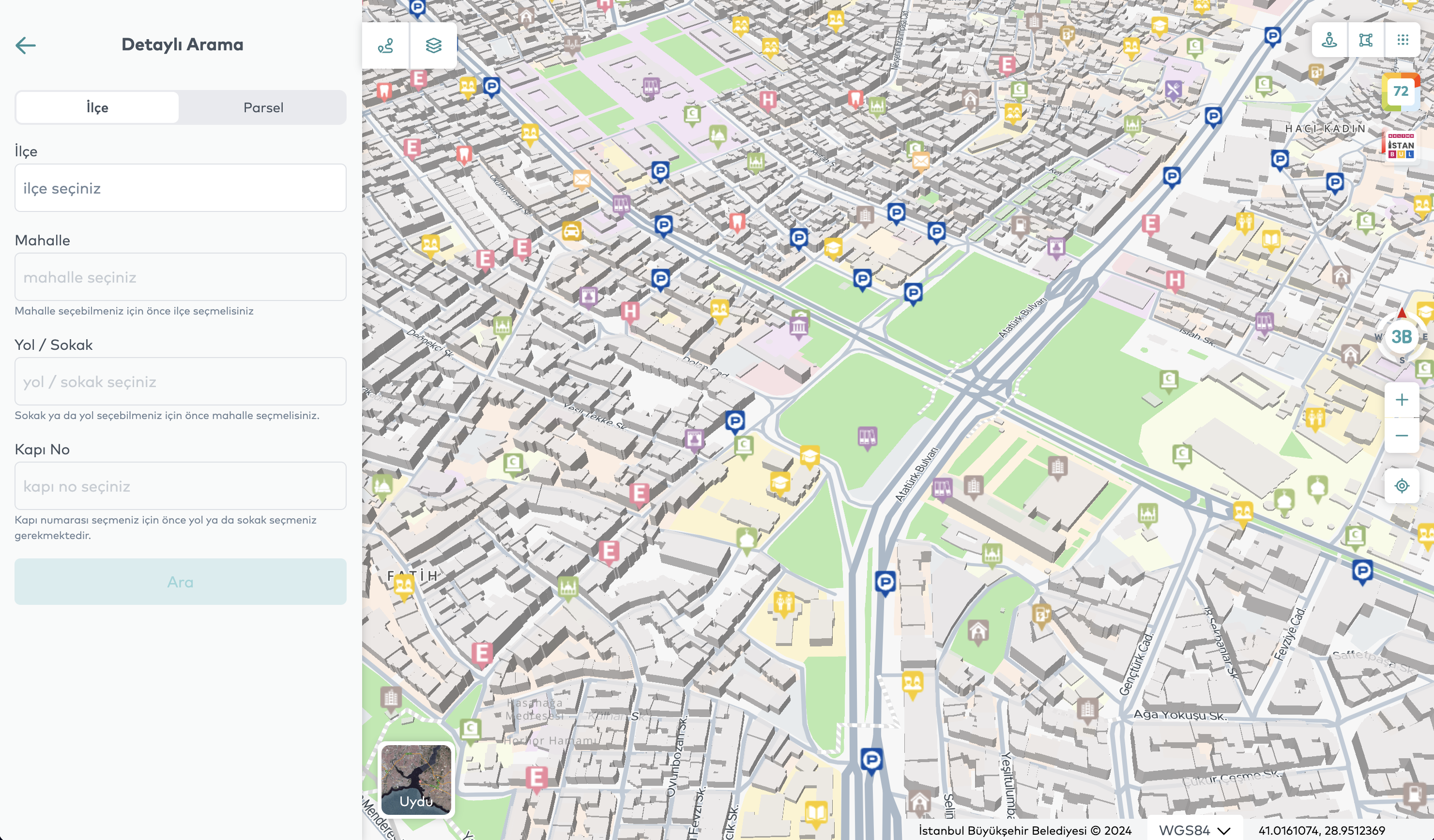 Map İstanbul has been designed to cover the entire city of Istanbul. The application includes spatial data for all neighborhoods, streets, avenues, squares, and public areas across Istanbul’s 39 districts. It provides detailed analysis capabilities through up-to-date satellite imagery, 3D modeling data, traffic density, weather information, and thematic map layers.