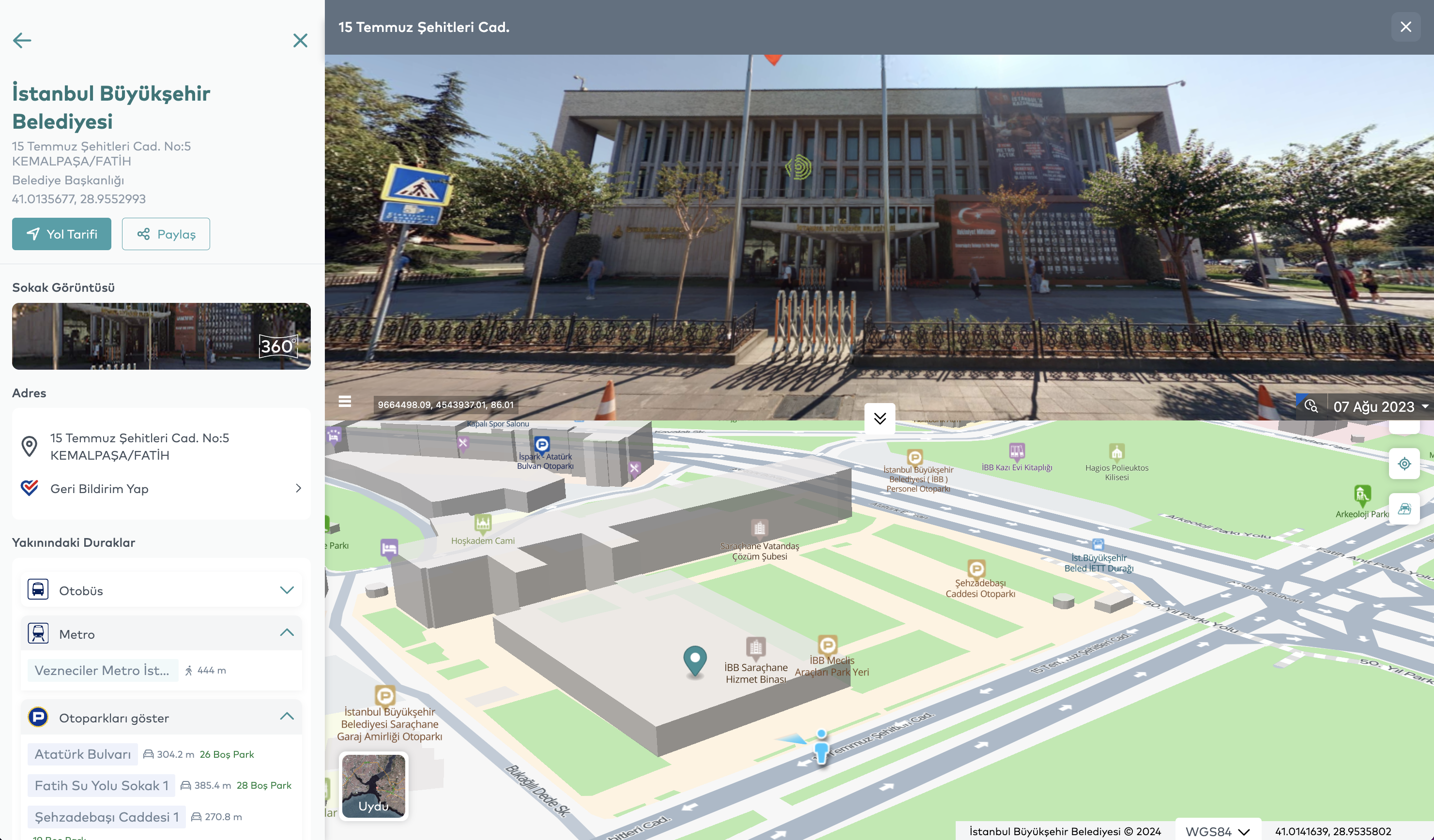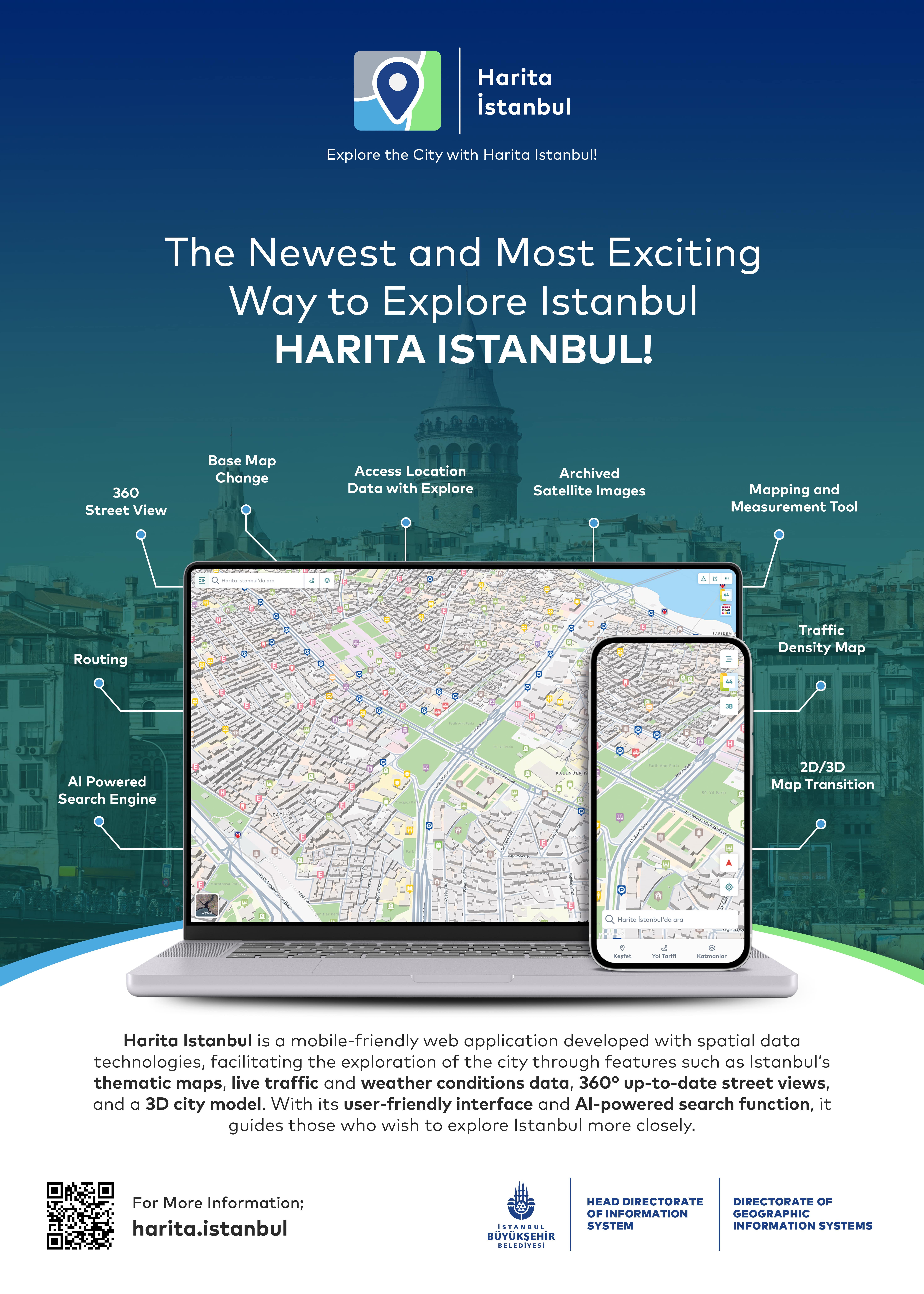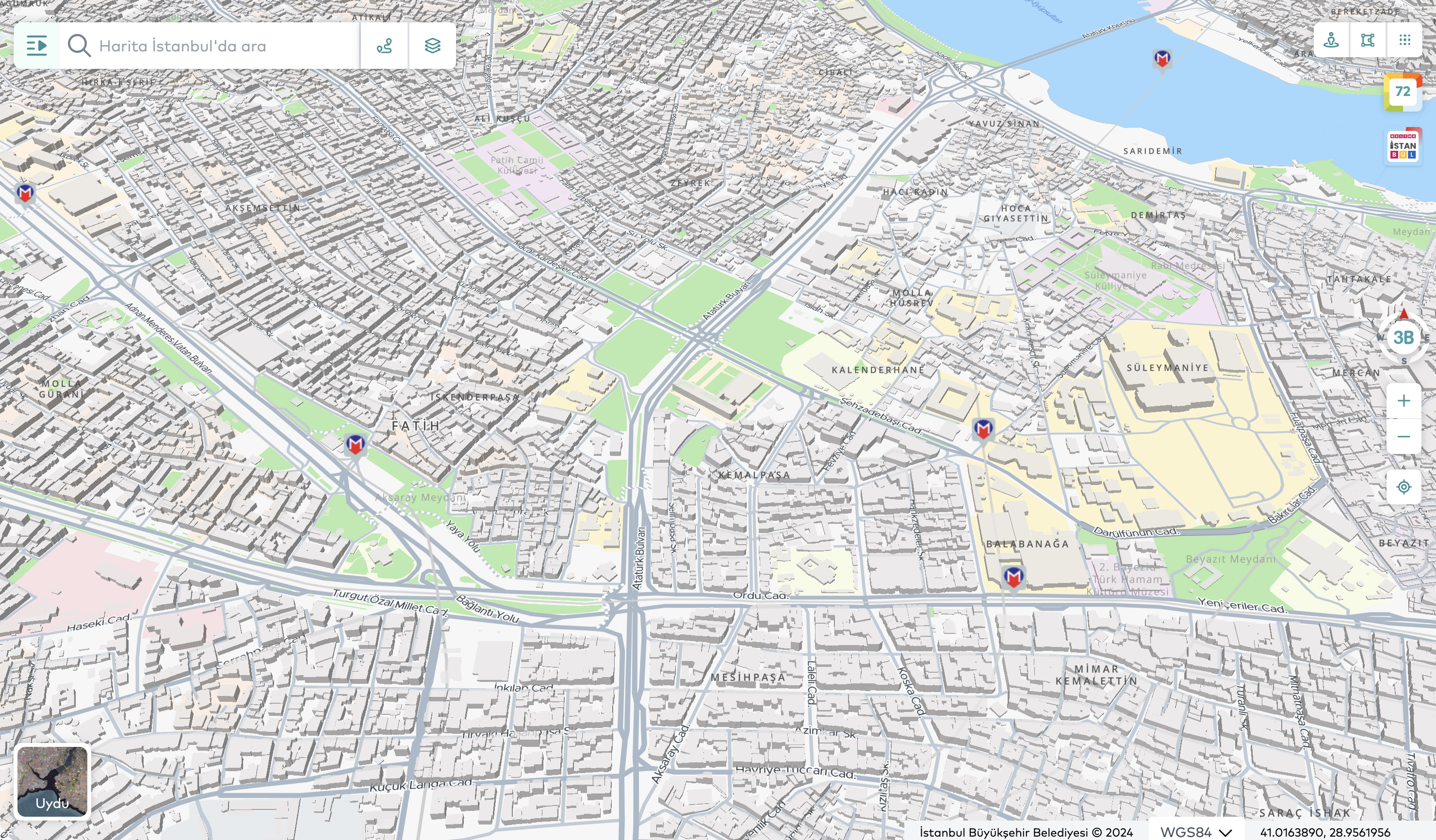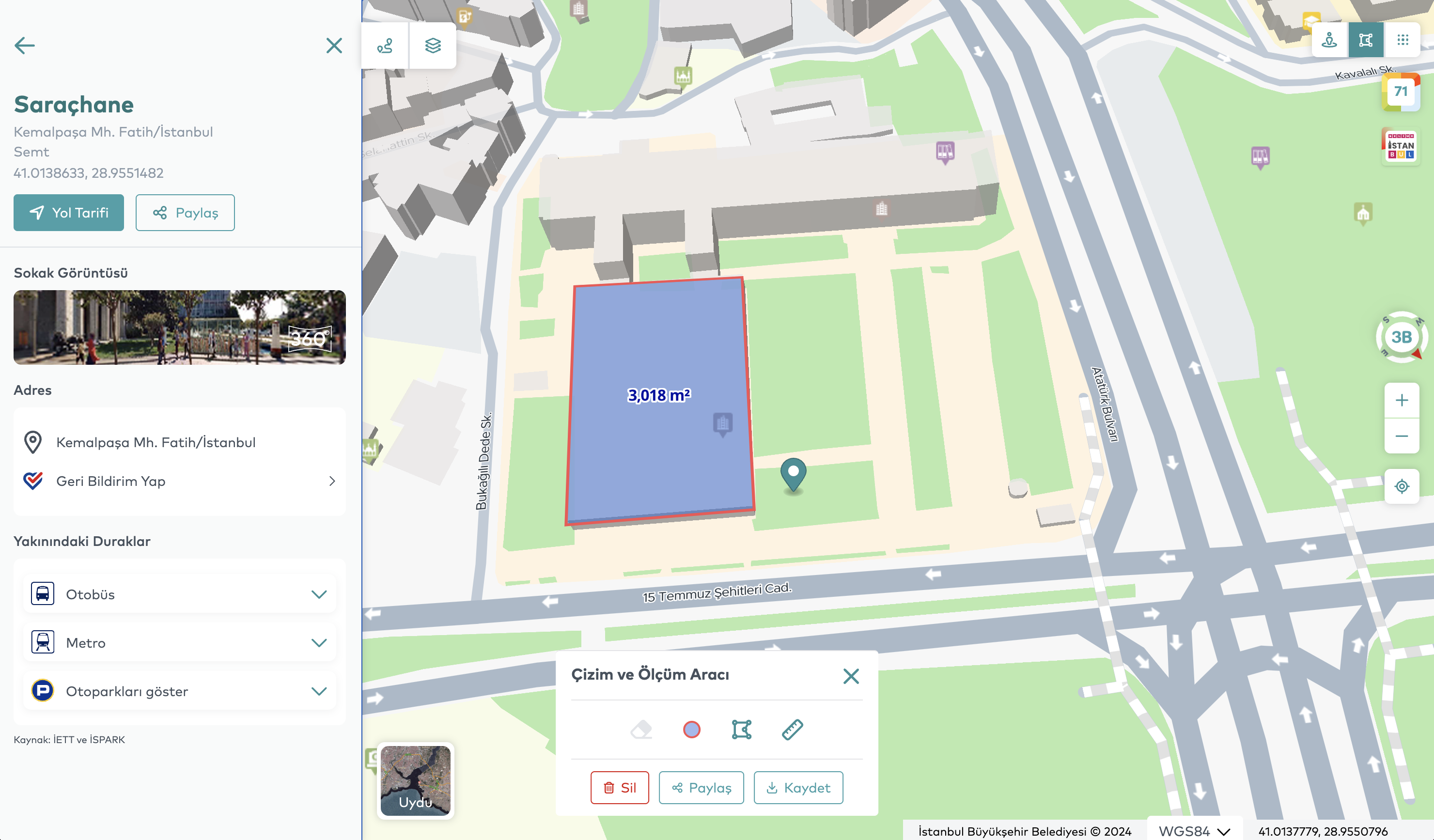 With its AI-powered infrastructure, the platform provides a comprehensive view of city data, serving as a powerful decision-support tool for both citizens and local administrators. Its data-driven analysis capabilities effectively support urban planning, city management, and strategic decision-making, positioning Map Istanbul as a key digital tool for local governments. For individual users, it acts as a daily life guide, while for institutional users, it offers a high-potential platform for modern urban governance. The application offers users fast and accurate location-based search through an AI-powered address search engine and a “search nearby” feature. Additionally, it supports efficient urban transportation planning by providing the ability to calculate routes for multiple points.The application also provides users with real-time information on traffic congestion and weather updates within the city, offering up-to-date data on urban mobility. This enables users to make informed travel decisions and, if necessary, choose alternative routes. Through 360° panoramic street views, users can explore various regions of Istanbul with both current and historical imagery. This feature serves as a valuable analytical tool for those wishing to examine the city’s physical transformation. Additionally, users can closely observe different spatial data of Istanbul via thematic maps and extensive data categories, and, with the timeline function, perform in-depth analyses of the city’s development process using historical satellite and aerial imagery.One of the core functions of the application is to enable users to measure distances and areas. This feature is particularly significant from a Geographic Information Systems (GIS) perspective, allowing highly accurate calculations for urban planning, construction, and real estate analysis.One of the most notable features of Map Istanbul is its 3D modeling of the city, which allows users to freely explore Istanbul in a highly realistic three-dimensional environment and experience the historic city along with its cultural heritage in an unforgettable way.In conclusion, Map Istanbul, accessible at https://harita.istanbul/ and https://map.istanbul/ is a powerful platform that integrates all data related to Istanbul, supported by artificial intelligence and a citizen-centered service approach. In addition to serving as a crucial tool for local governments, it holds significant potential as an application that facilitates residents’ daily lives and accelerates data-driven decision-making processes.