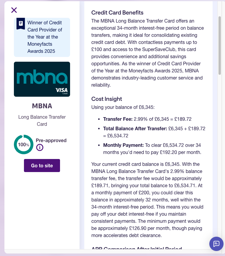 Credit Card Insights addresses a persistent friction point in consumer credit comparison. Customers visit our site knowing they want a better credit card deal, but the journey traditionally dumps them into tables of products with dozens of variables to decode. Even when we surface eligibility likelihood, customers still struggle to interpret what a 0% period or balance transfer fee actually means for their situation.